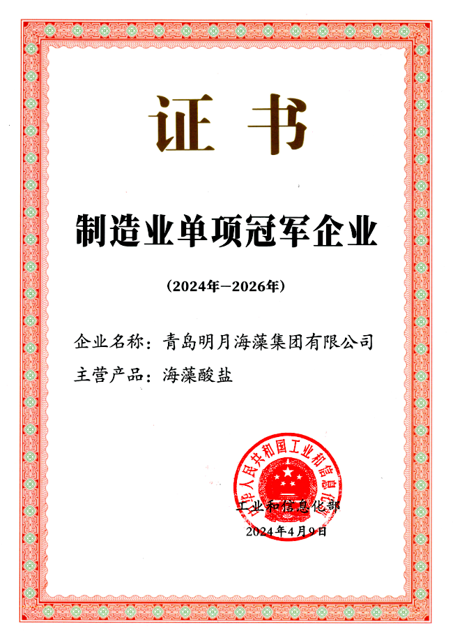4月,明月海藻集團獲2024-2026年國家制造業單項冠軍企業。
