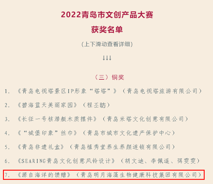 2022年,為保護(hù)、傳承、利用好傳統(tǒng)文化,推動優(yōu)秀傳統(tǒng)文化創(chuàng)造性轉(zhuǎn)化、創(chuàng)新性發(fā)展,落實(shí)《“山東手造”推進(jìn)工程實(shí)施方案》,青島市文化和旅游局、青島市廣播電視臺、青島開放大學(xué)共同啟動“山東手造 青島有禮”2022青島市文創(chuàng)產(chǎn)品大賽。經(jīng)過網(wǎng)絡(luò)線上投票,11月26日,最終評選出“2022青島市特色伴手禮”十項(xiàng),金獎10件、銀獎21件、銅獎32件及優(yōu)秀獎94項(xiàng)。青島明月海藻生物健康科技集團(tuán)有限公司文創(chuàng)產(chǎn)品《源自海洋的饋贈》榮獲設(shè)計(jì)類銅獎。