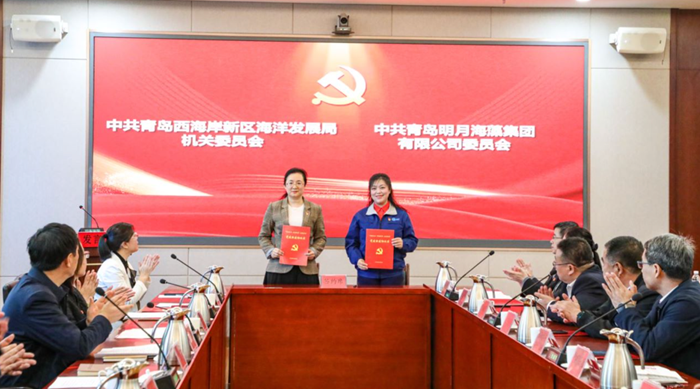 區海洋發展局機關黨委副書記王淑芳,青島明月海藻集團工會副主席、黨政辦公室總監楊曉菁,分別代表雙方黨委簽約。
