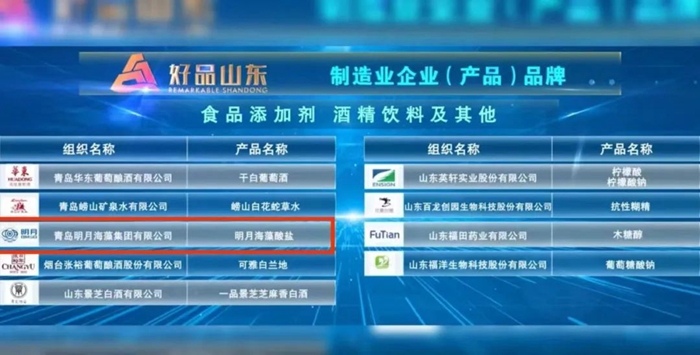 “明月海藻酸鹽”入選“好品山東”制造業企業(產品)品牌