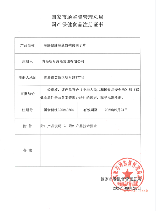 海賜健牌?海藻酸鈉決明子片獲批國家保健食品批件