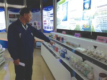 明月海藻工作人員向記者介紹海藻衍生產品