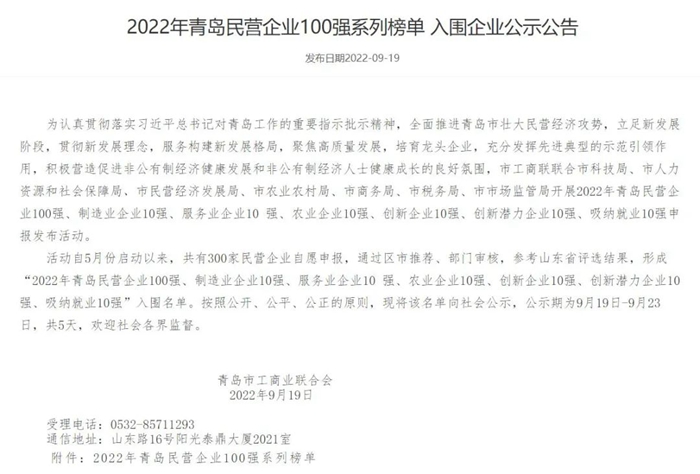 自今年5月份起,市工商聯聯合市科技局、市人力資源和社會保障局、市民營經濟發展局、市農業農村局、市商務局、市稅務局、市市場監管局開展2022年青島民營企業100強、制造業企業10強、服務業企業10強、農業企業10強、創新企業10強、創新潛力企業10強、吸納就業10強申報發布活動。